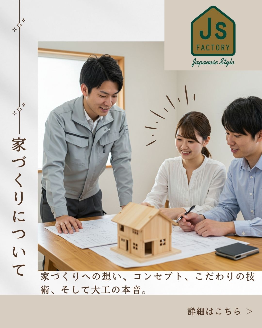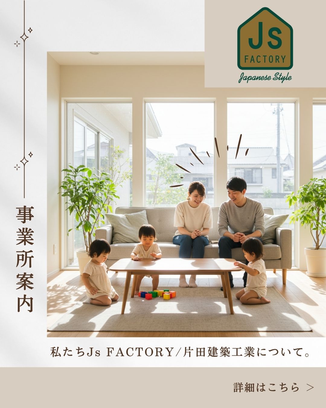Js FACTORY/片田建築工業は、家族の夢に寄り添い、自由設計と職人の確かな技で、世界に一つの物語を創造します。