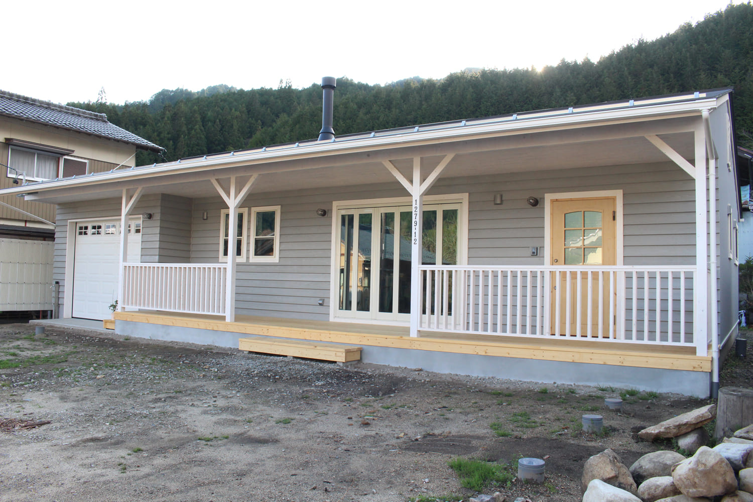 落ち着いたグレーのサイディングに、リズミカルに配置された白い窓枠とウッドデッキが映えるK様邸の外観。