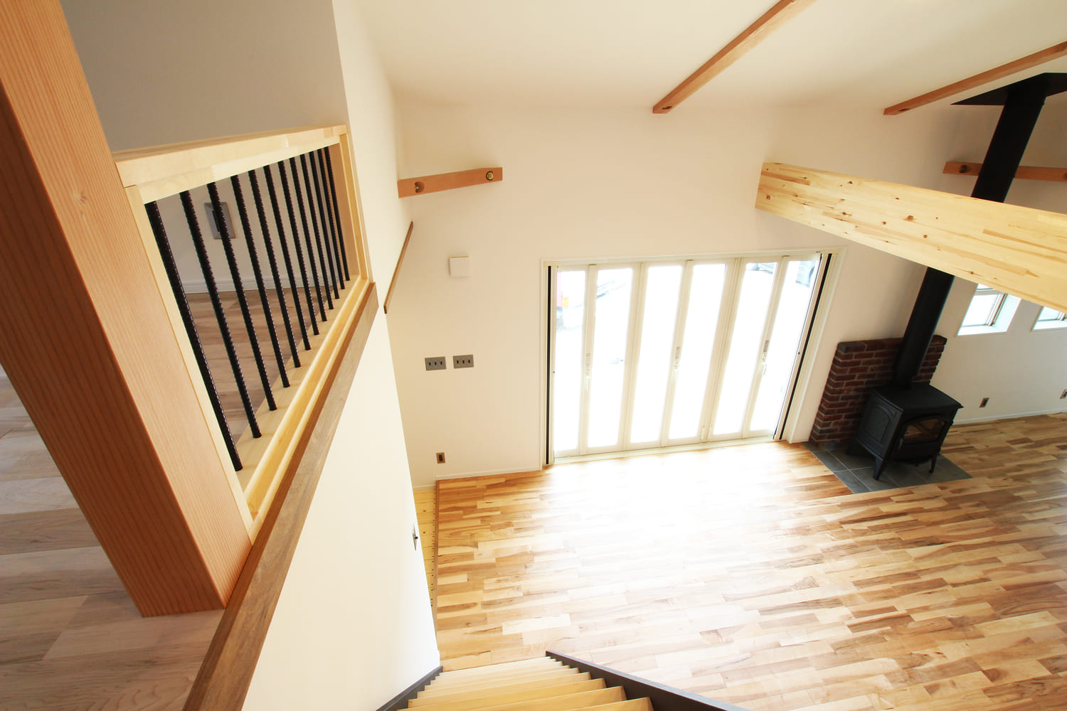 視線が抜けるオープンな設計は、吹き抜けの開放感をさらに高め、1階と2階を緩やかにつなぐコミュニケーションの架け橋に。