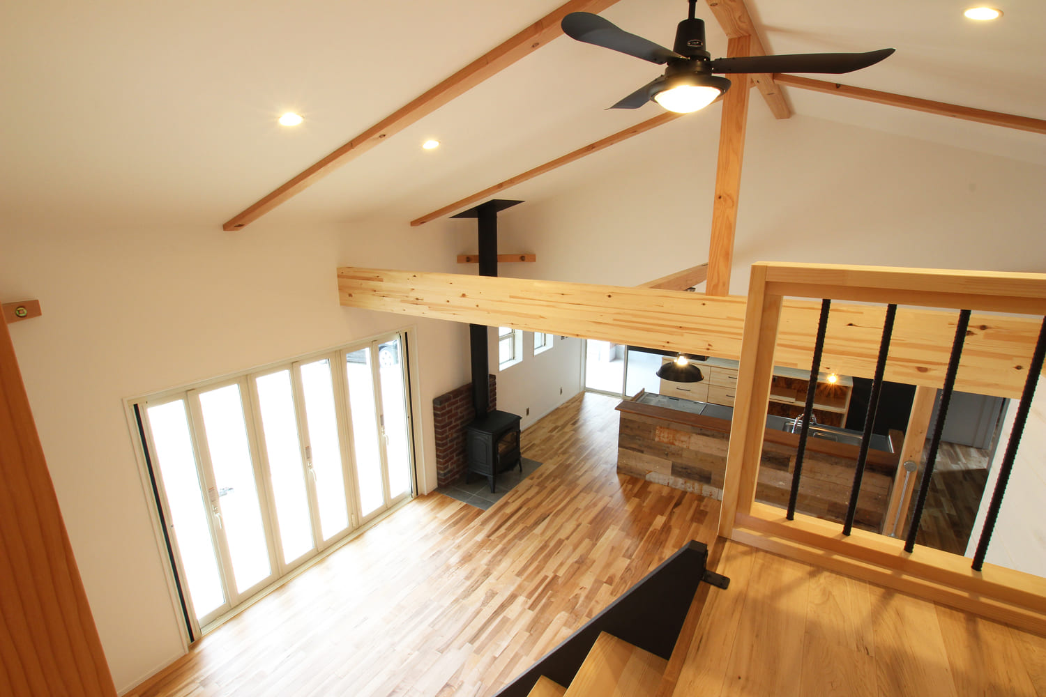 揺らめく薪ストーブの炎、吹き抜けから降り注ぐ陽光が心地よい空間を演出。