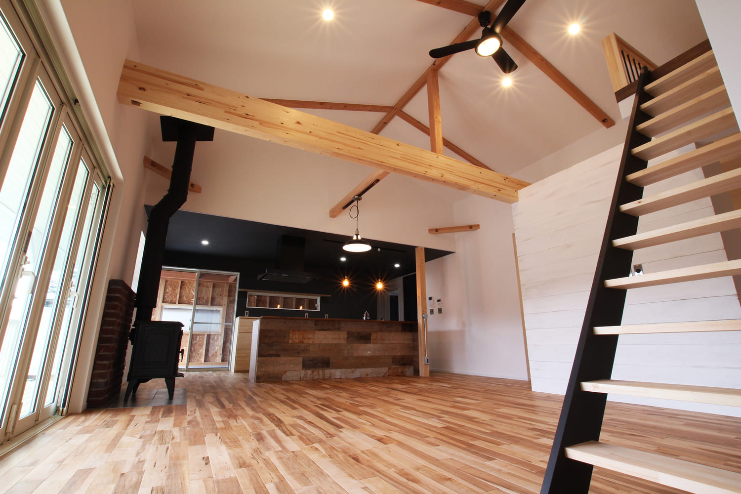 中心に設えられた薪ストーブは、冬には揺らめく炎で心まで温め、オフシーズンでも存在感のあるインテリアとして空間を引き締めます。