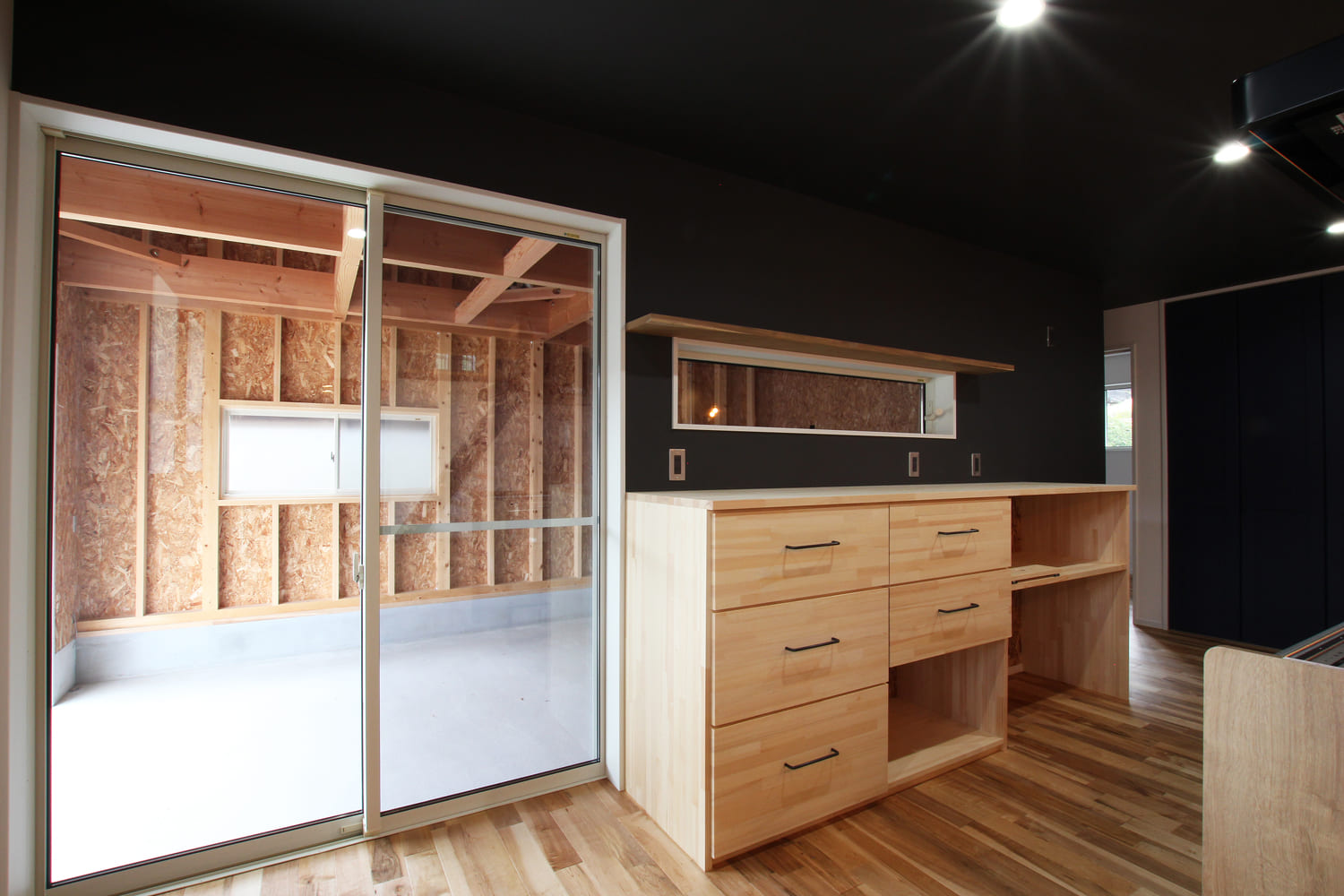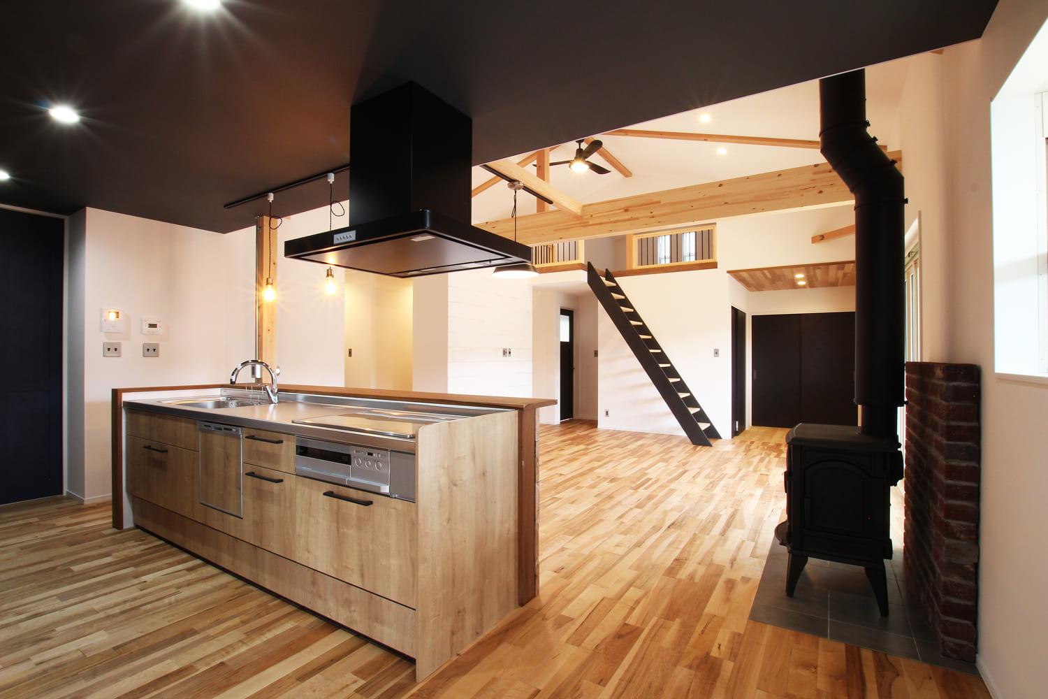 木の温もりを感じるカウンターと、シックなダークカラーの天井やレンジフードが絶妙なコントラストを生み出し、まるでカフェのような洗練された空間です。