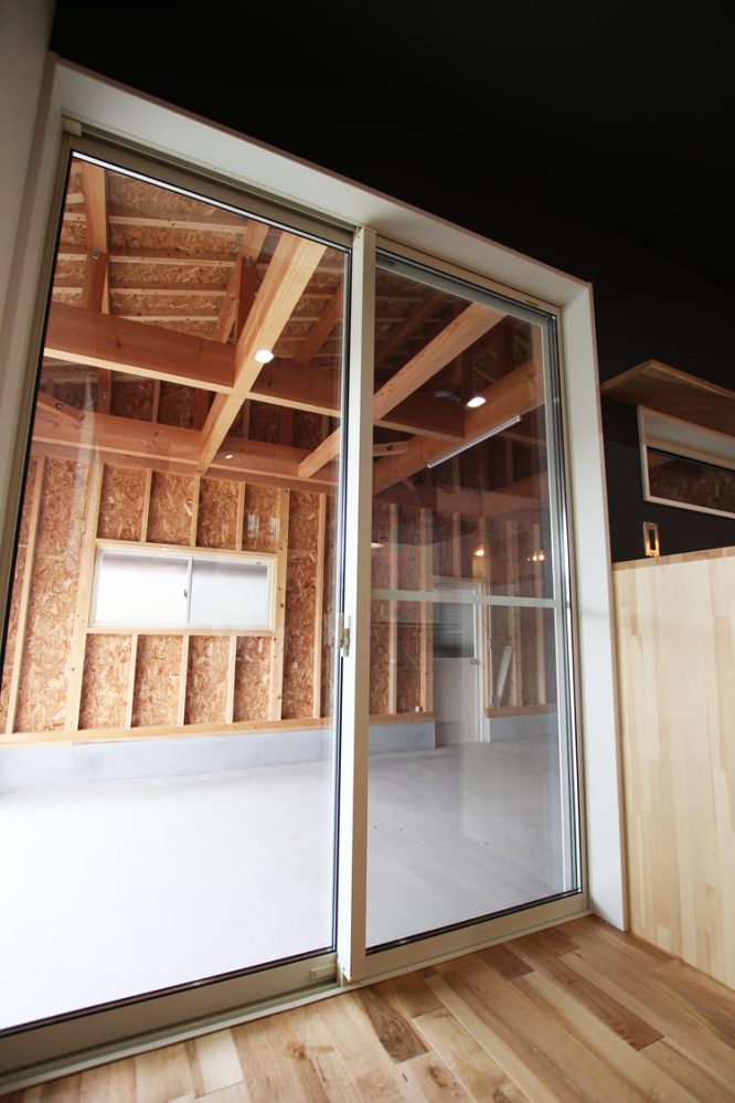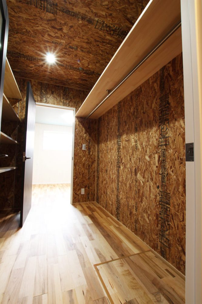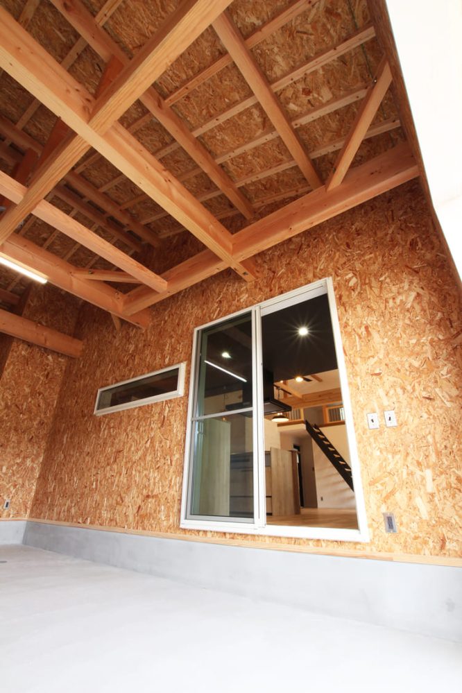 ガレージ内の壁にはOSB合板を使用し、ラフでありながらも機能的な仕上がりに。