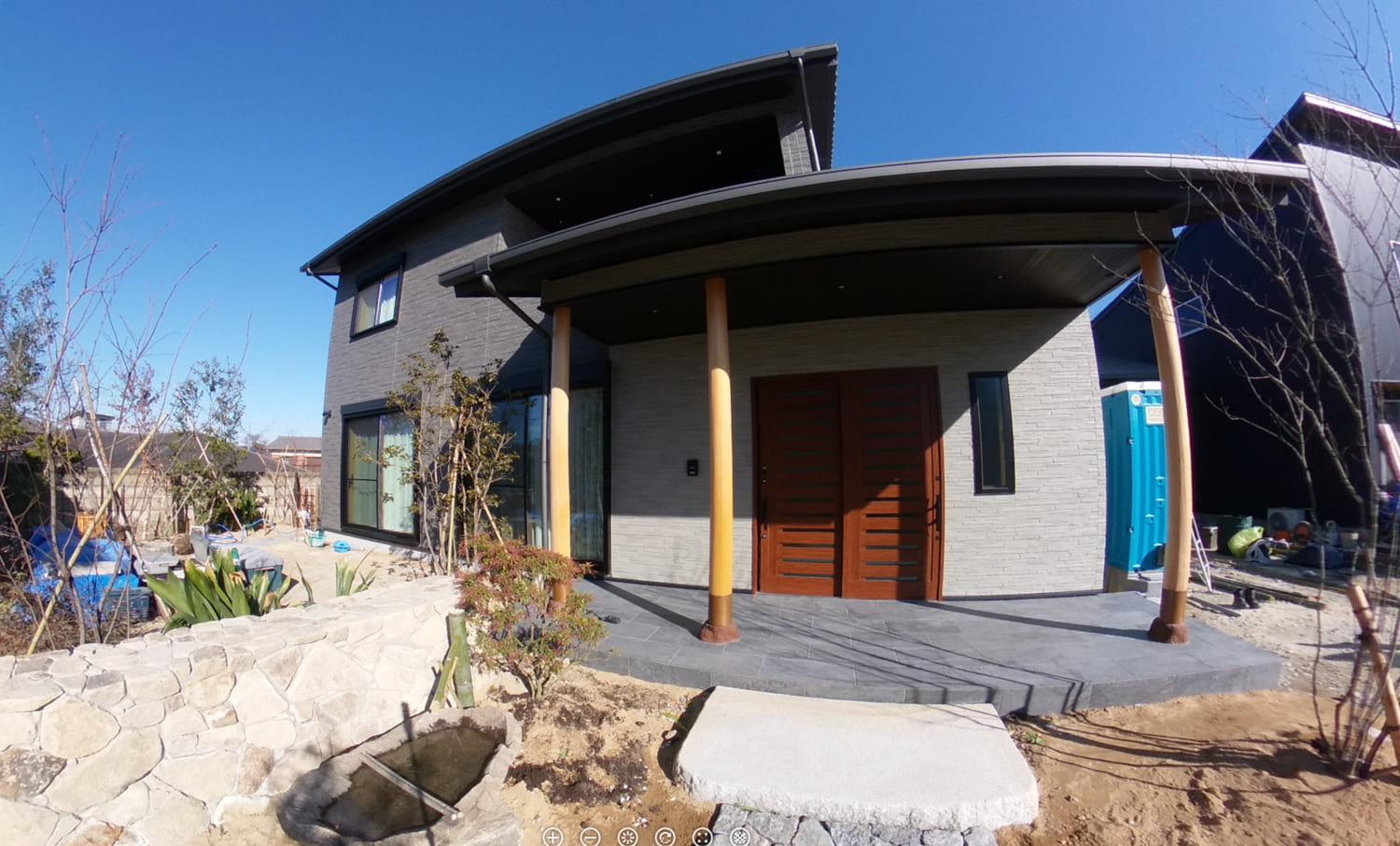 個性的なカーブを描く屋根のラインは、空の広がりを感じさせ、単調になりがちな外観に柔らかなアクセントを加えています。