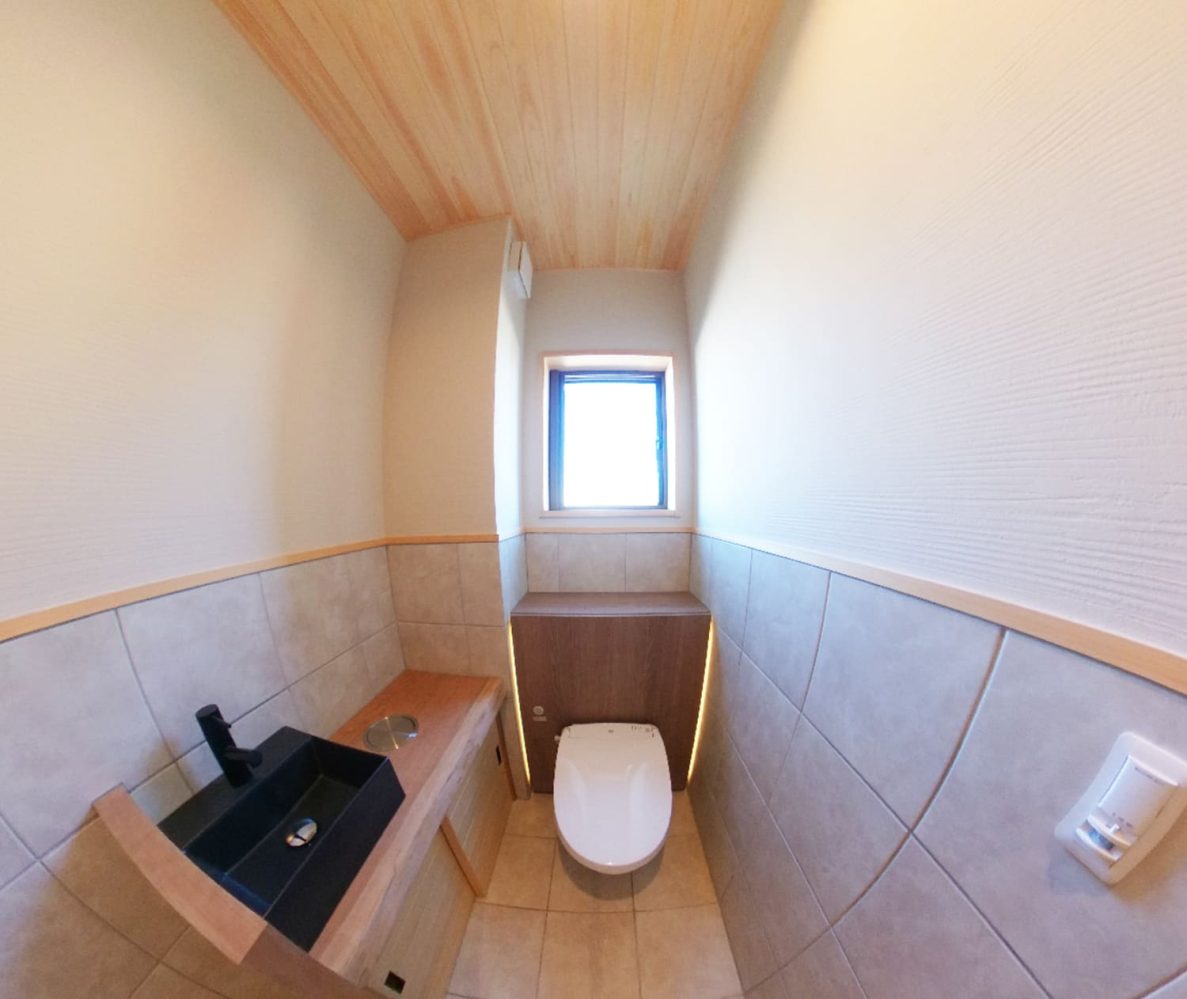 このトイレは、ただ用を足すためだけの場所ではなく、訪れるたびに心安らぎ、清潔感とデザイン性の高さに満たされる、まるでプライベートな隠れ家のような空間です。
