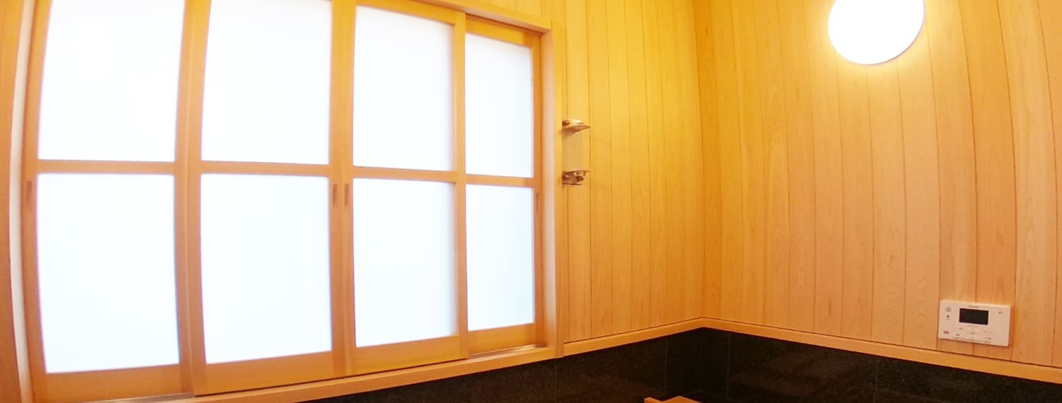 大きな窓には障子風のデザインが施され、外からの視線を気にすることなく、柔らかな自然光を感じながら湯浴みを楽しめます。